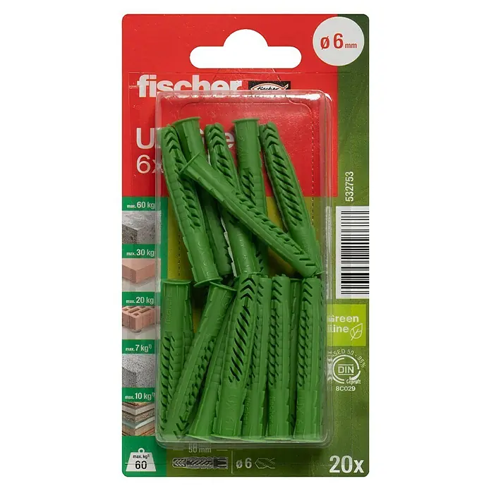 Sei stanco di dover comprare tasselli diversi per ogni tipo di muro? Con i Fischer DuoPower hai la soluzione universale! Questi tasselli intelligenti a 2 componenti decidono da soli come fissarsi: si allargano nei materiali pieni (come cemento o mattoni pieni), si piegano in quelli forati e si annodano nei pannelli (tipo cartongesso). La scatola contiene 8 tasselli da 40 mm, con il 20% di prodotto in più rispetto alle confezioni standard. Sono facili da usare: fai il foro, inserisci il tassello, avviti la vite (diametro 4,5-6 mm) e senti un 'click' quando è ben fissato. Hanno una resistenza altissima e non girano nel foro grazie al design anti-rotazione. Perfetti per montare mensole, console TV, lampade, cappe, tapparelle... Insomma, per qualsiasi lavoro di fai-da-te in casa. La qualità Fischer si sente: robusti, affidabili e pensati per durare.